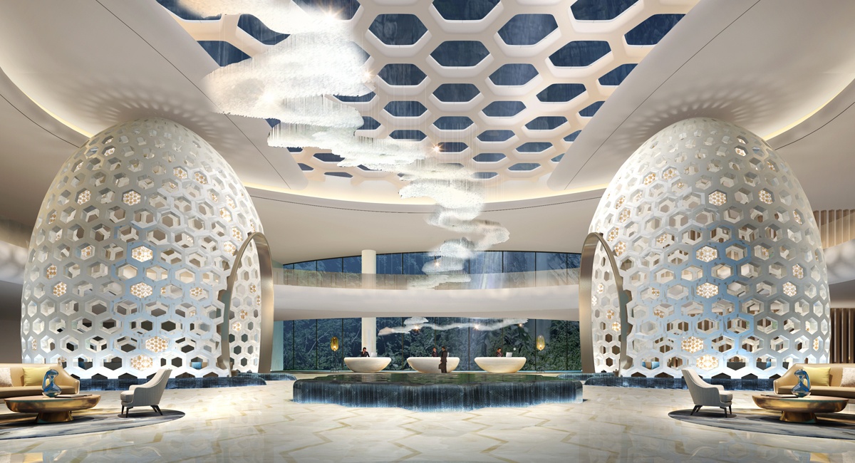 酒店設計靈感來源于蜜蜂的智慧蜂巢,每個正六棱柱蜂巢的底,都是由三個全等的菱形拼成的,并且每個菱形的鈍角都等于109°28’,故該酒店設計取名為109°28’,意在表達設計師追求完美的理念。